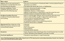 For a patient to be diagnosed with PTSD, he must have experienced or witnessed an event involving actual or threatened bodily injury or death or threat to physical integrity, and must have felt helpless, horrified, or terrified during the experience (see Diagnostic criteria).4 Examples can include war, disaster, accidents, and domestic violence. Diagnosis rests on identifying the major symptoms of PTSD, such as hyperarousal and numbing/avoidance behaviors. This diagnosis may lurk behind nonspecific symptoms such as headaches, insomnia, and stomachaches. Patients often have difficulty describing the problems. Patients can be reluctant to talk about their traumatic events, "battle fatigue," and nightmares of war, and may be unable to describe symptoms.