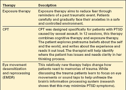 Effective treatment strategies include a combination of psychotherapy, such as cognitive-behavioral therapy (CBT), and psychosocial and medication treatments. Other therapies, including prolonged exposure (PE), cognitive processing therapy (CPT), and skills training, are used for many patients with PTSD (see Common alternative therapies for PTSD).3,4 However, the Institute of Medicine reports that evidence is inadequate to support the efficacy of PE, CPT, and eye movement desensitization and further research is needed.14 Medication is usually recommended for psychiatric comorbidities, suicidal ideation, severe and continued symptoms, continued difficulty functioning, and if psychotherapy is ineffective. Pharmacotherapy includes antidepressants and newer antianxiety or mood-stabilizing medications.