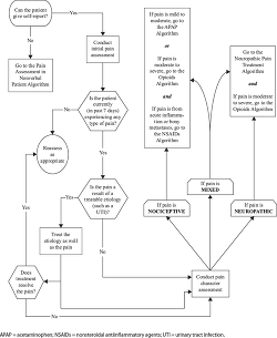 The nurse caring for Ms. Gordon recognizes that pain is a significant factor in her patient's limited mobility. The nurse isn't sure which treatment will be most effective in helping Ms. Gordon to regain her previous level of independence. The first step toward managing her pain is a thorough pain assessment. The nurse refers to the algorithm shown in Figure 1 to guide the assessment, beginning with the oval shape in the upper left-hand corner.