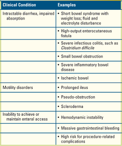 "If the gut works, use it." This guiding principle for selecting PN candidates has taken on even greater significance as substantial clinical benefits of enteral nutrition (EN) have come to light. Compared with PN, tube feeding lowers the risk of metabolic and infectious complications and, when initiated in the early phases of critical illness, improves outcomes and shortens lengths of stay-all at a fraction of the cost of intravenous feeding. Many of these benefits occur simply because EN maintains normal digestive and absorptive pathways. Other benefits are related to preservation of immune activity. The presence of nutrients within the gut supports intestinal cells that produce a variety of immune factors, in part explaining why EN carries a lower risk of infectious complications than PN. Because of these advantages, PN is reserved for situations in which the enteral route is not an option.2 Appropriate PN recipients typically have medical conditions that prevent oral or EN, such as impaired digestion and absorption of nutrients, persistent vomiting or diarrhea, or inability to achieve enteral access.5,6Table 1 provides more detail regarding PN indications.