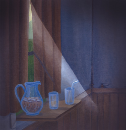 Miss Elsie, the reclining hostess, sipped tea through an antiquated straw, and I, the invited guest, sipped tea from a blue glass. How easy it would have been to ignore the little wooden shelf, adorned with the simple means of connecting two people. But then I would have betrayed what it meant to nurse someone, to be there, to surrender to the needs of my patient.