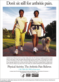 The campaign focused on relating the message that "moving is the best medicine" and sought to create an urgent sense of awareness about OA and compel baby boomers with arthritis to realize that they can take simple steps to change the course of the disease. The ads targeted those ages 55 years and older who were living with or at risk for OA. Physical activity and weight loss were the focuses of the television and radio spots, posters, and outdoor print advertisements. The campaign drove people to the Web site http://www.fightarthritispain.org, where they could learn about decreasing pain and improving function.