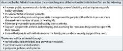 The National Public Health Agenda for Osteoarthritis. In early 2008 the CDC and the AF began to collaboratively seek ways to reduce the public health burden of OA over a three-to-five-year period. More than 75 partners from a variety of disciplines convened in the spring of 2009 at an OA summit, which resulted in The National Public Health Agenda for Osteoarthritis (OA Agenda).15 See Table 2 for its 10 recommendations); for the full document, see http://www.arthritis.org/osteoarthritis-agenda.