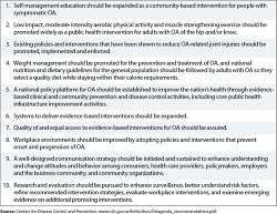 Summit participants identified four public health strategies that can reduce pain, functional loss, and disability from OA and improve the quality of life for those with it: self-management education, physical activity, injury prevention, and weight management.