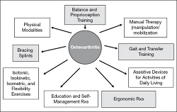 Rehabilitation for symptomatic OA targets impairment and restriction of activities and may be useful in modifying OA risk factors. Typical signs and symptoms include pain, joint swelling, joint stiffness upon waking and after prolonged inactivity, crepitus, loss of range of motion, and bony deformity. Possible impairments that limit activity include reduced grip strength and difficulties with transfer, imbalance, walking, and stair climbing, and these can lead to an inability to remain employed and engage in social activities. The magnitude of such restrictions in people with knee OA, for example, equals that found in people with heart disease, congestive heart failure, and chronic obstructive pulmonary disease.2 Rehabilitation interventions include exercise, manual therapies such as mobilization and manipulation, physical modalities such as application of heat and ice, splinting and bracing, orthotics, assistive devices, ergonomic modifications, and education (see Figure 1). While these do address the impairments and limitations, the evidence supporting their use is inconclusive.