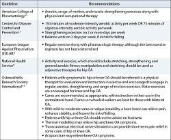 Exercise is the most studied intervention and appears to provide modest benefits with respect to pain, function, and disability. Clinical practice guidelines and professional society guidelines have been developed based on expert opinion and a synthesis of the literature.3-10 All identify exercise as a main component of OA management (see Table 13-5, 7, 9-12). Some of the guidelines also support the use of assistive devices, orthotics, and self-management strategies.9, 10