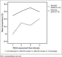 At each of the four PACU assessment time intervals (on admission, 30 minutes after admission, 60 minutes after admission, and at discharge), mean oral temperatures were significantly higher in the warming gown group than in the standard blanket group (P = 0.009) (see Figure 1 and Table 2). On admission to the PACU, one patient in the warming gown group was hypothermic (35.9[degrees]C), as were three patients in the standard blanket group (34.5[degrees]C, 34.6[degrees]C, and 34.7[degrees]C). Overall, patients in the warming gown group had significantly higher oral temperatures in the PACU than did patients in the standard blanket group (P < 0.001).