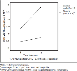 Figure 2 depicts each group's mean scores for postoperative pain intensity, assessed using the 0-to-10-point VNRS. Patients in the standard blanket group had higher mean postoperative pain scores at 12 hours (4.4) and 24 hours (5.8) after surgery than did those in the warming gown group at 12 hours (3.4) and 24 hours (3.6) after surgery; however, these differences did not reach statistical significance (P = 0.08). There were also nonsignificant differences in the proportions of each group experiencing postoperative pain at an intensity of 4 or greater. At 12 hours postoperatively, 60% of the standard blanket group and 43% of the warming gown group reported a mean pain score of 4 or greater (P = 0.36). At 24 hours postoperatively, 87% of the standard blanket group and 57% of the warming gown group reported a mean pain score of 4 or greater (P = 0.08).