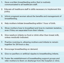Step 3 of the Baby-Friendly initiative is that mothers of all healthy infants should be encouraged to breastfeed and receive information on the benefits of breastfeeding. Mothers still have a choice of how to feed their babies, but if their choice is not to breastfeed, nurses at the hospital provide education related to the benefits of breastfeeding (Table 1). If the mother's decision remains the same, nurses document that education on the benefits of breastfeeding was provided. For mothers who chose to formula feed, appropriate education is provided.