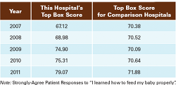 Table 2 shows results of a Top Box survey that indicates mothers at our hospital felt strongly that they learned how to "properly feed their babies" compared to other hospitals nationwide. Top Box is the percent of parents who gave a score of five or "strongly agree" to a question on the survey. Although mothers of comparison hospitals in the Top Box database indicated this was true 71.88% of the time, at our hospital mothers felt it was true 79.07% of the time in 2011. This reveals a nearly 12% increase from 2007 for the hospital when Baby-Friendly techniques were fairly new. Although 12% represents a significant increase, we continue to monitor our scores monthly and search for ways to reach and maintain a score of 80%.