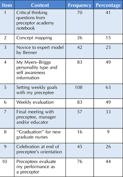 Because the preceptors were from 18 hospitals, it was not possible to determine if they incorporated knowledge learned at the NPA into their practice through observation. Therefore, a list of content items from the NPA was included in the survey (see Table 1).