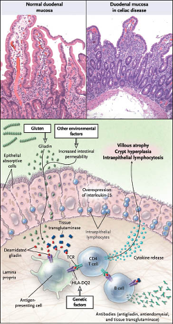Celiac disease is a T-cell-mediated, autoimmune, genetic illness that targets the small intestine; in most people the duodenum is affected first, although often the jejunum is also involved.1 The disease has been described as "a permanent intolerance to ingested gluten that damages the small intestine, characteristically inducing crypt hyperplasia and villous atrophy, and typically resolves with removal of gluten from the diet."2 (Gluten is a complex protein found in wheat and other grains.) Other names for the illness include celiac sprue, nontropical sprue, endemic sprue, gluten enteropathy, gluten-sensitive enteropathy, and gluten intolerance.