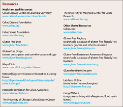 Patients need good psychosocial support as well. Because their symptoms are often vague, many patients go from provider to provider for years before receiving a diagnosis of celiac disease. (Indeed, many of us believed we were crazy because, for months and even years, no provider could find a reason for our symptoms.) Nurses can listen and provide patients with information and emotional support. They can also refer patients to knowledgeable providers who will take patients' complaints seriously, offer further information, and perform a thorough workup, including biopsy. The Celiac Sprue Association (http://www.csaceliacs.org) maintains a list of celiac centers that specialize in caring for patients with celiac disease, and will help patients in finding a site close to home.
