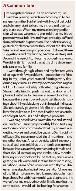 "I am a registered nurse. My first symptom of celiac disease appeared when I was six, when I began bruising for no apparent reason. Over time, I suffered from 26 vague and multisystem symptoms. I went from doctor to doctor and was repeatedly tested for gallbladder disease and treated for anemia, osteopenia, and other symptoms. But no one ever put the puzzle pieces together. I was finally diagnosed at the age of 63, when my brother's diagnosis of celiac disease led me to believe I had it, too; a duodenal biopsy confirmed that I did. By then, I had a hemoglobin count of 8 g/dL, was enduring frequent migraine headaches and repeated bouts of bronchitis, and was severely depressed with suicidal ideation-all of which disappeared when I eliminated gluten from my diet."