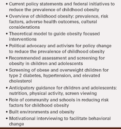 Although pediatric health outcomes have dramatically improved in areas such as oncology and neonatology, the prevalence of the chronic diseases associated with childhood obesity has risen for all age groups (Lee, 2007). There are components currently integrated into undergraduate and graduate curricula as well as staff development that can be specifically applied to preventive strategies for childhood obesity. Specific education content for students, nurses, and APNs can be found in Table 1. Therefore, it is necessary for nurse and staff educators to develop the skills of students, nurses, and APNs in the following areas: political activism, assessment and screening, community health, promotion of breastfeeding, evaluation of the built environment, and motivational interviewing. Proficiency in informatics is a necessary foundation for maintaining competency and currency in these areas because nurses need to use technology to search for evidence-based practice recommendations, communicate and educate families, and facilitate interprofessional collaboration.