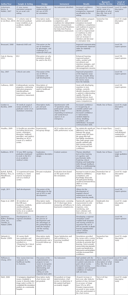 A literature search was initiated using CINAHL to find articles about the use of HFS in the acute care setting. The search criteria included articles published in nursing and peer-reviewed publications within the last 5 years, in English, about the use of HFS and with a focus on nurses. Exclusion criteria were articles that focused on nursing students or other health professionals. In addition, no dissertations or unpublished documents were included in this review. Although much has been written about the use of simulation in nursing education, only 14 articles were initially found that met these search criteria. An additional six articles were identified by referring to the citations in these original articles. Three articles focused on the history of simulation and, therefore, were not included in this review. Sixteen articles were found to be research based and were used for this review. Six articles were found that described HFS and its advantages and how to implement the technology but were more "how to" articles. These articles have been included as expert opinion. Most of the articles (8) that were research based were descriptive studies. Four studies used a pretest/posttest design, and a fifth study used chart audits with a pre-posttest. There was one exploratory qualitative study and one randomized control study (see Table 1). Research was evaluated using the Research Quality Review Rating Scale developed by Gaspar at the University of Toledo (2009). This scale guides the reviewer to examine the research article with regard to ethical considerations (were they addressed), the sample (size and description), setting (described), variables (instrument appropriate, validity and reliability adequate), design (appropriate for the hypothesis and standardized), data collection (described, blinding), and results/analysis (sample size adequate, appropriate statistics, and any obvious inaccuracies present). The resultant ratings vary from free of major flaws, to mostly free, to moderately free, and to somewhat free, with the worst rating being not at all free.