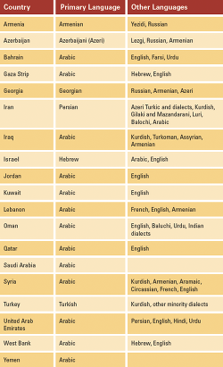 Sources vary in their definition of "Middle East." For the purposes of this article, the author is using the criteria of The World Factbook (Central Intelligence Agency, 2009), which considers Armenia, Azerbaijan, Bahrain, the Gaza Strip, Georgia, Iran, Iraq, Israel, Jordan, Kuwait, Lebanon, Oman, Qatar, Saudi Arabia, Syria, Turkey, the United Arab Emirates, the West Bank, and Yemen as the countries of the Middle East. Although Arabic is the predominant language, Armenian, Azerbaijani, Farsi (Persian), Hebrew, Kurdu, Turkish, and Urdu, among others, are also spoken (Table 1). It is important to be aware that there are a variety of Arabic dialects. A patient who indicates that he or she speaks Arabic may not understand someone who uses a different Arabic dialect.