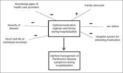 Parkinson's disease is a progressive neurodegenerative disorder of the dopaminergic motor pathways. The four main motor symptoms are bradykinesia, rigidity of the limbs or trunk, involuntary tremor, and postural instability.1 Other symptoms can include a range of cognitive changes (including attention and memory deficits, personality changes, and hallucinations), mood disorders (including depression, anxiety, and irritability), loss of facial expression, and diminished automatic reflexes. Symptom management is heavily dependent on patients receiving their antiparkinson medications at the appropriate dosages and timing, which in turn is dependent on other variables (see Figure 1). Since surgery and hospitalization can disrupt medication regimens, it's important to minimize such disruptions to promote optimal symptom management.
