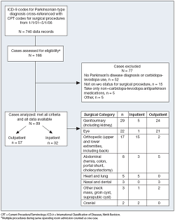 For the rest of the data abstraction process, one of the four data abstractors would choose a patient having a procedure or group of procedures from the top of the list and search for the patient's EHR. The abstractor would then determine whether the patient met inclusion or exclusion criteria. If the patient was excluded, a notation was made on the spreadsheet and the abstractor took the next patient on the list. For included patients, the de-identified data abstracted from the EHR included demographic information (age, sex, population of the patient's city of residence, race or ethnicity); the surgical procedure performed; the start and end times of surgery; the year of surgery; comorbidities; Parkinson's disease symptoms and exacerbations referenced in nursing, neurology consult, or progress notes; the pre- and postoperative regimen for all Parkinson's disease-related medications; all other drugs and dosages administered to the patient during the entire perioperative period as defined earlier; and whether the surgical procedure was an inpatient or outpatient procedure.