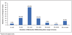 Medication withholding. The data for withholding of carbidopa-levodopa were not normally distributed. The median time of medication withholding for the 89 surgical events was 12.35 hours (range, 4.35 to 143.05 hours). For inpatient procedures (n = 32), the median withholding time was 16.75 hours (range, 6 to 143.05 hours); for outpatient procedures (n = 57), the median withholding time was 11.38 hours (range, 4.35 to 20.59 hours). As shown in Figure 3, 62% of the surgeries (n = 55) resulted in medication withholding times of between 10 and 20 hours, and 17% of the surgeries (n = 15) resulted in withholding times of 20 or more hours (with more than half of these [n = 9] resulting in withholding times of 30 or more hours).