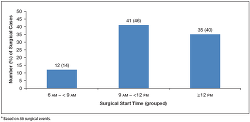 Surgical start times. The surgical start time for one case was missing, so data analysis for this measure was performed on 88 surgical cases. The mean surgical start times for the entire sample and for only the outpatient procedures were similarly early (11:53 AM [+/- 2:58] and 11:35 AM [+/- 2:21], respectively), while the mean surgical start time for the inpatient procedures was later (12:25 PM [+/- 3:48]). As shown in Figure 4, the majority of the surgical procedures (76 of 88) started after 9 AM, with almost half (41 of 88) starting between 9 AM and 12 PM. Only 12 of 88 procedures started between 6 and 9 AM.