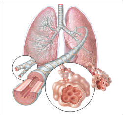 As functional lung volumes change, pathophysiologic sequelae become clinically evident. Airway narrowing reduces expiratory flow, causing rapid, shallow breathing that leads to lung hyperinflation. Respiratory muscles become overworked, and dyspnea ensues. Cough and ventilation-perfusion mismatch worsen (see Ventilation-Perfusion Ratio). Parenchymal destruction inhibits gas exchange, resulting in hypoxemia, with or without hypercapnia.5