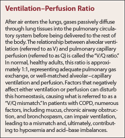 Because excess oxygenation can lead to hypercapnia and acidosis in patients with COPD, arterial blood gases (ABGs) should be checked 30 to 60 minutes after oxygen therapy is initiated. Venturi masks deliver high-flow oxygen at relatively accurate rates, but the less precise nasal cannula, which delivers lower concentrations of oxygen, is usually better tolerated because it allows patients the freedom to speak, eat, and drink. Because oxygen delivery is more variable with the nasal cannula, measure ABGs more frequently in patients using this delivery method, based on the stability of their condition, the frequency of oxygen titration, and clinical judgment.