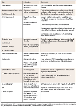 After an initial assessment, a variety of tests can be used to quantify the severity of an exacerbation, establish a specific etiology, differentiate a COPD exacerbation from other conditions with similar symptoms, and uncover potential comorbid conditions. For example, lung hyperinflation, which is common in COPD exacerbations, can mask coexisting cardiac and pulmonary signs. Based on patient history, clinical suspicion, or patient failure to respond to traditional exacerbation treatment, investigate the causes of symptoms that may be unrelated to COPD exacerbation. For a list of tests and the indications for their use, see Table 1. 5, 28-30
