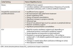 Some patients with COPD exacerbations can be safely and effectively treated at home; others require hospitalization (see Table 2 for a list of determining factors5, 31). Closely monitor patients treated at home for indications that hospital admission is required, such as significant increase in symptom intensity, onset of cyanosis or peripheral edema, need for ventilatory support, or insufficient improvement with home treatment.5 Patients needing noninvasive ventilatory support may or may not require ICU admission, depending on an institution's policy. If treated outside the ICU, such patients require extremely close monitoring, as their condition may deteriorate quickly. If noninvasive ventilation fails, clinicians need to be able to initiate invasive mechanical ventilation rapidly. All patients requiring mechanical ventilation must be admitted to the ICU. Changes in mental status or hemodynamic instability are indications for direct ICU admission.5 Likewise, severe dyspnea that is unresponsive to initial treatment, persistent or worsening hypoxemia (when partial pressure of oxygen in arterial blood [PaO2] is less than 40 mmHg), or persistent or worsening acidosis (when pH is less than 7.25) despite supplemental oxygen may indicate the need for invasive ventilatory support in the ICU.5