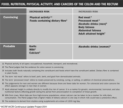 An updated SLR for colorectal cancer in 2010 added data from 263 new articles published between 2006 and 2009 and found that evidence for a protective effect from foods containing dietary fiber had strengthened.4 The CUP Panel concluded that this link was convincingly causal, upgraded from probable in 2007. The evidence for convincing or probable causal links between other exposures and colorectal cancer was consistent with the 2007 Expert Report: physical activity, garlic, milk, and calcium were found to be protective, and red meat, processed meat, alcoholic drinks, and greater degrees of body fatness, abdominal fatness, and adult attained height were found to increase risk.5-11 The panel's conclusions regarding colorectal cancer are summarized in Figure 3.