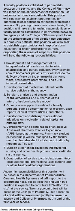The agency and the university joined forces in July of 2007. At that time, the agency identified a need for a drug information expert to help with their clients' complex medication regimens. A pharmacy resident temporarily joined the agency 3 days/week to provide medication-related information to nurses and to determine how a pharmacist might fit into their home healthcare model. A year later, the agency and the university established a joint faculty position, allowing a pharmacist to remain on staff permanently. The pharmacy program's objective is to have a pharmacist visit clients in their homes to identify, resolve, and prevent medication-related problems, allowing clients to stay safely in their homes. The goals are to improve clients' ability to take medications correctly and reduce client emergent care and hospitalizations resulting from inappropriate medication use (see Box 1 for the physician description of the pharmacist in this role).