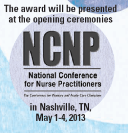 The 2013 NP of the Year award honors excellence in clinical expertise, leadership, community service, and education. The award will be announced in the June 2013 issue of The Nurse Practitioner and presented at the National Conference for Nurse Practitioners opening ceremonies in Nashville, TN, May 1-4, 2013. The winner will also receive a complimentary full conference registration to this year's program.
