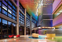 As much as the new tower is designed to be in tune with its surroundings, it is even more responsible to the environment. Its shape maximizes daylight potential while minimizing heat gain, and well-shaded outdoor courtyards result in reduced energy usage. Local materials were used in the tower's construction, with a focus on minimizing off-gassing and maximizing recycled products. The facility's reductions in water usage achieved savings of 5.5 million gallons of water a year, compared with standard systems.