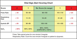 In prompting the nurse to perform a complete assessment and confer with the charge nurse when the score is in the yellow zone, the algorithm takes into account that, at this point, the nurse relies on clinical expertise to personalize care. For example, a patient with pneumonia admitted to the hospital through the ED may have a yellow VSA score on admission because of hypoxia, increased respirations, and tachycardia, but would be expected to achieve a green VSA score within 48 hours following the administration of iv antibiotics, oxygen, and other treatments. Likewise, although oxygen saturation levels below 90% are usually considered critical and requiring of action, they are often baseline values in patients with chronic lung disease. Similarly, in an athlete who may have low baseline respiratory and resting pulse rates, a yellow score would not indicate a need for intensive monitoring.