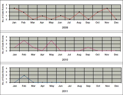 The VSA system was implemented on the pilot unit of our hospital in June 2010. Over the following year, the pilot unit effectively reduced the number of out-of-unit codes from 16 to three (see Figure 5). Because VSA scoring was fully automated once data were entered into the EMR by assistive personnel, the VSA system added nothing to the nurses' normal workload. An informal survey of nurses on the pilot unit indicated that nurse satisfaction increased with the use of the VSA system, which eliminated excessive manual data entry required by the EWS system. Nurses reported that they felt the VSA system allowed them to monitor large numbers of patients quickly and easily. In 2011, nursing research conducted on a comparable 39-bed unit at a sister community hospital within the Sentara Healthcare system produced similar positive results.