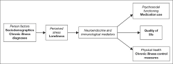Theoretical basis. The theoretical framework for this study is the psychoneuroimmunology (PNI) paradigm, which is concerned with "the mechanisms of bidirectional communication between the neuroendocrine and immune systems" and may be used to guide relevant research.25 As Zeller and colleagues have stated, per this paradigm, the experience of a stressor can elicit neurologic and immune system responses that in turn can affect physical health, psychosocial functioning, and quality of life.25 For this study, loneliness was conceptualized as a biopsychosocial stressor that influences mind-body interactions. In accordance with the PNI paradigm, we posited that the stress of loneliness, in combination with sociodemographic and individual health-related factors, elicits a neuroimmunological response pattern that influences chronic illness, chronic illness control, and quality of life. For a model of the PNI framework integrated with the study variables, see Figure 1.