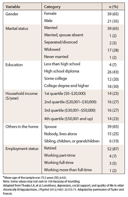 Measurements.Sociodemographics. Data on age, gender, marital status, education level (highest attained), annual household income, employment status, and living situation were collected. Age was measured as years at the time of the interview. Gender was self-reported and dichotomous, categorized as male or female. Marital status was categorized as "never married," "widowed," "separated/divorced," "married with spouse absent from home," or "married with spouse living at home." ("Widowed" was used to refer to both men and women whose spouses have died.) Education level was assessed categorically for completion of grade school, middle school, high school, some college, associate's degree, bachelor's degree, master's degree, and doctoral degree. Annual household income was measured using $10,000 incremental categories, beginning with "less than or equal to $20,000" and ending with "greater than $100,000." Employment status was categorized as "retired," "working part-time," "working full-time," "working more than full-time," or "unemployed." Living situation was assessed using two variables, the number of people living in the home and their relationship to the participant.