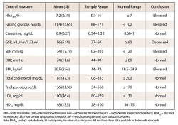 Chronic illness control. Laboratory test results were gathered from the electronic medical records. Laboratory studies that had been performed in the preceding 12 months were included in the data collection. For participants with diabetes, fasting glucose and glycated hemoglobin (HbA1c) levels were collected, when available, as a measure of diabetes control. The lipid profile was collected as a measure of hyperlipidemia control. Creatinine and glomerular filtration rate (GFR) were collected as measures of renal disease control. Blood pressure was taken during the interview as a measure of hypertension control. Resting heart rate was assessed during the interview as a measure of heart function. Kapoor and Heidenreich found that elevated resting heart rates were associated with increased mortality in people with both heart failure and preserved left ventricular function; they concluded that resting heart rate should be considered when assessing cardiovascular risk.32 BMI was calculated as a measure of obesity; this was felt to be important since obesity is a factor in many chronic illnesses.