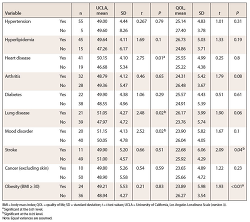 Relationships among loneliness, quality of life, and chronic illness. Mean differences in loneliness and quality of life scores based on chronic illness diagnosis are reported in Table 3. Participants with a diagnosed mood disorder such as anxiety or depression had the highest loneliness scores (mean, 51.15; SD, 4.13) followed by participants with lung disease (mean, 51.05; SD, 4.27) and those with heart disease (mean, 50.15; SD, 4.10). Participants with a diagnosis of stroke had the lowest overall quality of life scores (mean, 22.68; SD, 6.06). Participants who were obese had significantly lower quality of life scores than those who were not obese. Those with mood disorders, lung disease, or heart disease had significantly higher loneliness scores than those without these illnesses.
