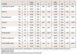 Mean comparisons of loneliness and quality of life scores associated with the use of specific medications are reported in Table 5. Benzodiazepine use correlated significantly with higher loneliness scores (r = 0.272; P = 0.04) and lower quality of life scores (r = - 0.445; P < 0.01). Participants with lung disease that required bronchodilator use also reported significantly lower quality of life scores. Use of diuretics and nitrates were also associated with a lower quality of life. These results provide partial support for hypothesis 3: participants with loneliness had higher numbers of chronic illnesses, higher numbers of prescription medications, and lower quality of life, although they did not have poorer chronic illness control.