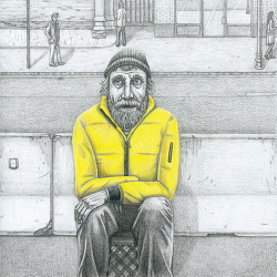 It was an unusually cold Sunday in October. I rushed out to look for him. I wasn't surprised to find him in his usual spot between the Jersey barriers, swathed in blankets. I led him across the street and asked him to wait in front of the Dunkin' Donuts while I went to get him some clothes. When I returned with a set of men's clothes and a canary yellow down jacket, Patrick looked at me, then glanced disdainfully at the jacket and said that if he wore it, he would stick out like a sore thumb. He asked me where in the world I had gotten it.