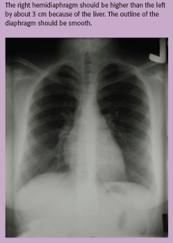 CXRs should always be taken during maximum inspiration to allow visualization of any pulmonary abnormalities.5 When the patient inspires deeply, the diaphragm should be seen at the segment of the 6th rib anteriorly.6 If 10 posterior ribs can be counted above the diaphragm, it's an excellent inspiratory CXR. If fewer than 10 ribs can be counted above the diaphragm, it's either poor inspiratory effort or a sign of low lung volume.2 The right hemidiaphragm is usually higher than the left because of the location of the liver. Poor inspiratory effort can cause the CXR to appear whiter, with increased lung markings, and can also give a false impression that a lower lobe pneumonia is present.3