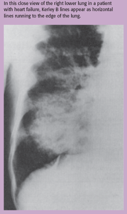 Kerley B lines can also be seen on a CXR in a patient with pulmonary edema. (See Kerley B lines.) These are thin, horizontal lines of fluid, no more than 2 cm long, which can be seen in the lung periphery near the costrophrenic angles and lateral wall.2