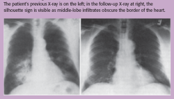 When attempting to decide which lobe the infiltrate occupies, look for the silhouette sign. When the silhouette sign is seen in the anterior structures, the pneumonia is in the left or right upper lobe of the lung.5 If the silhouette sign obscures the border of the right or left hemidiaphragm, this indicates a lower lobe pneumonia. When the right lower lobe border is lost but the right hemidiaphragm is visible, a right middle lobe pneumonia is present.8