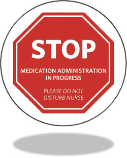 We decided to post two octagonal red signs on the sides of each medication cart; the signs looked like stop signs with the following lines of text: "STOP/MEDICATION ADMINISTRATION IN PROGRESS/PLEASE DO NOT DISTURB NURSE" (see Figure 1). Because the signs were posted on each side of the medication carts, they could be seen by anyone who approached from either side. We were concerned that staff members and others might eventually become used to a permanent sign, so we proposed using removable signs that would be displayed on the carts only when medications were being administered.