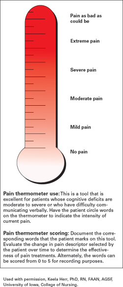 The Numeric Rating Scale is a commonly used pain rating scale in which individuals are asked to select a number between 0 and 10 that best reflects their current intensity of pain. Although the tool has been found to be a reliable and valid pain intensity measure, older adults, both with and without cognitive impairment, may have difficulty with the scale (Gagliese et al., 2005). The Iowa Pain Thermometer (Herr et al., 2007; see Figure 1) is a modified Descriptive Verbal Scale that provides the patient with a choice of seven pain descriptors illustrating different levels of pain intensity (no pain, slight pain, mild pain, moderate pain, severe pain, very severe pain, and the most intense pain imaginable). The patient is also allowed response options between words (scored from 0 to 12) all of which are aligned next to a pain thermometer. The patient is then shown the scale and is reminded about how temperature rises in a thermometer and is then asked to think of pain as increasing in the body as it rises to the top of the thermometer. The patient is then asked to identify their level of pain intensity. This tool may be used with patients who have moderate-to-severe cognitive impairments or who have difficulty communicating.