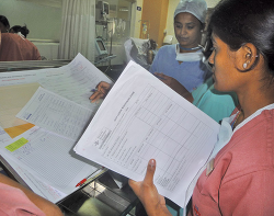 By the time patients are moved from the ITU back to the ward, most are mobile again, which significantly reduces the risk of pressure ulcer formation. At this point the Skin Lesion Monitoring form is replaced with a Daily Monitoring of Skin Lesions form, which calls for skin checks at each shift change. (At NHCH, the day and evening shifts each last seven hours, while the night shift lasts 10 hours.) But the same chain-of-custody practices continue. At the end of each shift, the incoming staff nurse checks the skin of each patient to be in her or his care, with both the incoming shift-nurse-in-charge and the departing staff nurse observing. The incoming staff nurse accepts responsibility for each patient only if the skin is intact; if it isn't, the incoming nurse signs the form accepting the patient, but notes that this problem was preexisting.