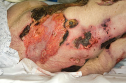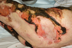 On arrival. By the time Ms. W. arrived at our facility for her scheduled clinic appointment, her pain level had increased considerably, so her husband bypassed the appointment and brought her directly to the ED. She presented with full-thickness necrosis in multiple anteromedial areas of both thighs, as well as of the abdomen, pelvic region, and right breast. She was also quite depressed and withdrawn. On admission she was taken first to the operating room for skin and soft tissue biopsy specimens and initial wound debridement (see Figures 1 and 2). The initial workup included laboratory analyses and a computed tomographic (CT) scan to visualize and determine the extent of calcification. The CT scan showed extensive superficial soft tissue damage in the areas of her left groin and both upper thighs. On arrival she was using the topical antimicrobial bacitracin applied to all wound beds; and was taking the systemic antibiotics cefepime, 4 g daily; metronidazole, 1,000 mg daily; and vancomycin, 1,600 mg daily. Except for vancomycin, these were all continued.