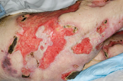 The backstory. About six months earlier, Ms. W. had experienced flu-like symptoms that included excessive fatigue and elevated temperatures, rhinitis, cough, and congestion, and she began treatment with antibiotics. Eight days later, she felt worse and went to her local ED, where she was diagnosed as being in renal failure. A biopsy revealed thrombosis within the kidney vasculature. Hemodialysis was started and she continued on it for about eight weeks until her kidney function returned. During this time, she was given heparin, but after developing mild erythema and skin discoloration on her thighs and abdomen, she was diagnosed with thrombotic thrombocytopenic purpura and the heparin was discontinued. She also experienced a superficial burning sensation on her thighs and legs that progressed to skin breakdown consisting of multiple large erythematous bullae. (Later we found a similar case in the medical literature, with the patient having a history of good health and subsequently developing acute respiratory and renal failure due to hypercalcemia of unknown etiology.8)