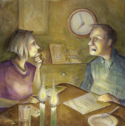 And so we began our after-dinner talks, at the table with candles burning, our real conversations about topics we'd chosen. We each had a list. Sometimes the 20 minutes seemed to go on forever, and we'd stop too early. But then I started timing the conversations with the kitchen clock. At first our efforts were minimal and tired, talking because we knew we had to; but then we started getting into it, taking turns with themes. We talked about books we read and films we'd seen. We shared ideas about our writing projects. It was often frustrating to try to understand Hal's sentences, but eventually I could, even if it took two or three repetitions. It was like the conversational French classes I'd had in high school-talking to someone in a language you were just learning, trying to grab onto the words you understood in the midst of those you didn't. The difference is that in learning a foreign language, you gradually come to understand more. But in Hal's case it doesn't get easier.